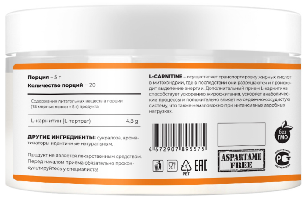 Каждая порция содержит 4800 мг л-карнитина. Смешайте 1,5 мерные ложки препарата с 300-400 мл воды. Начинайте принимать напиток за 25 минут до тренировки и далее в течение ее.