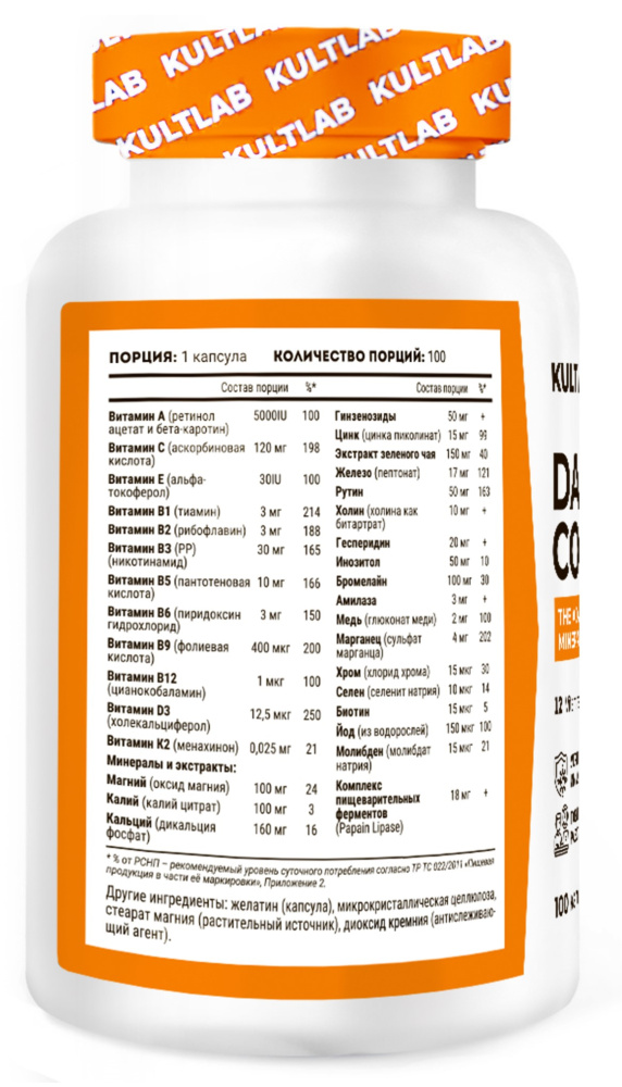 Витаминный комплекс Kultlab Daily Complex на 100% восполняют суточную потребность организма в микроэлементах, что фактически делает тебя неуязвимым перед вирусами, инфекциями и авитаминозом.