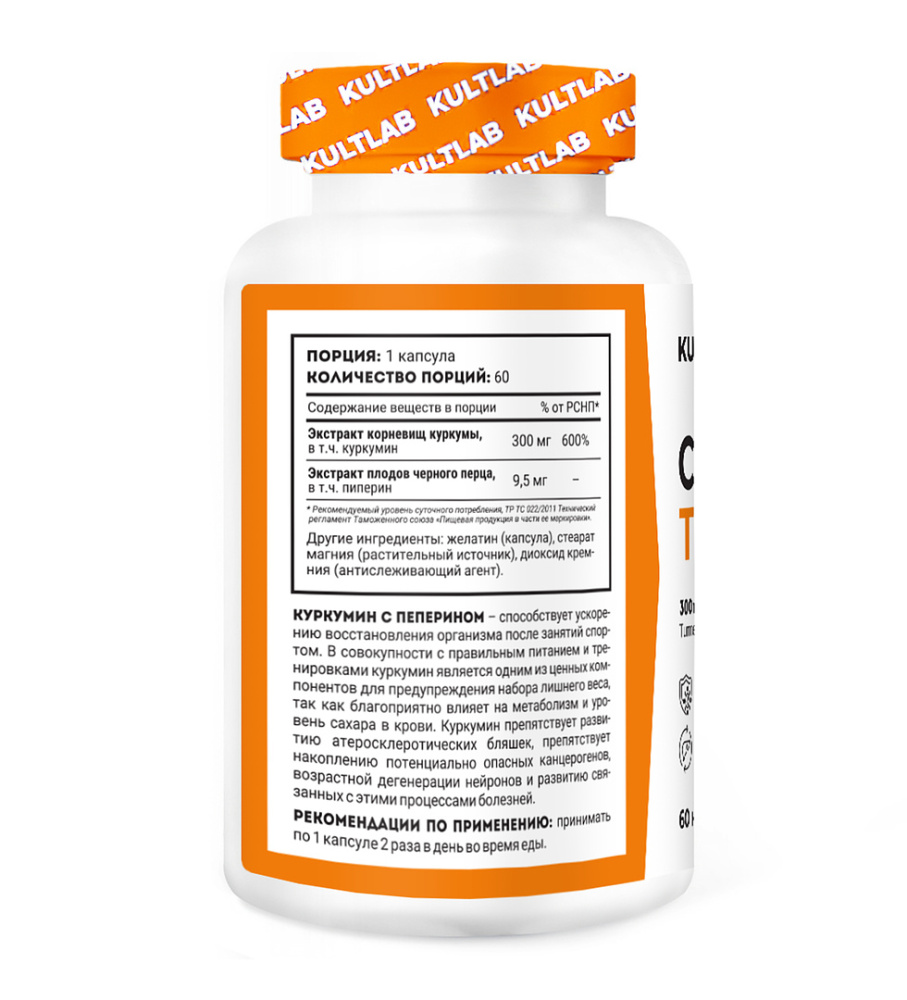 Куркумин с пиперином - способствует ускорению восстановления организма после занятий спортом. В совокупности с правильным питанием и тренировками куркумин является одним из ценных компонентов для предупреждения набора лишнего веса, так как благоприятно влияет на метаболизм и уровень сахара в крови. Куркумин препятствует развитию атеросклеротических бляшек, препятствует накоплению потенциально опасных концерагенов, возрастной дегенерации нейронов и развитию связанных с этими процессами болезней.