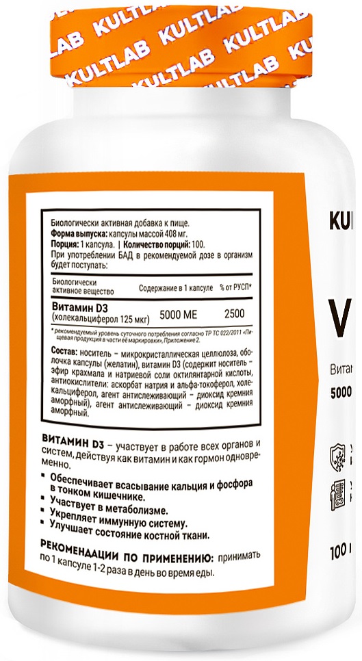 Витамин D3 от KultLab уникален - он одновременно действует и как витамин, и как гормон. Как витамин он поддерживает уровень фосфора и кальция в плазме крови и повышает всасывание кальция в тонкой кишке.